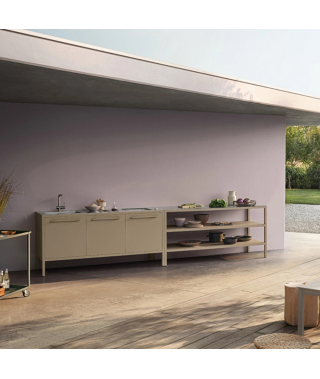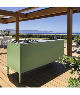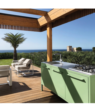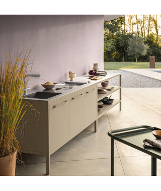 Le Frame Kitchens Outdoor sono disponibili a 2 o 3 unità (128 o 188 cm di larghezza) in 13 finiture Fantin abbinabili ai top in acciaio Barazza da 4 mm. Possono essere dotate di barbecue integrato a gas in inox, che consente di cucinare senza fumo e con grande praticità, grazie alla qualità dei materiali e all’alta tecnologia impiegata. Le cucine e i banconi sono disponibili anche per gli esterni grazie a un trattamento di cataforesi che previene la formazione della ruggine.