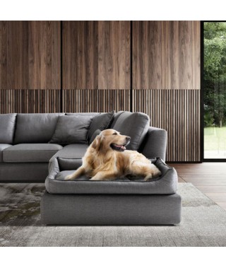 Vassoio in pannello di particelle di legno in classe E1 rivestito in texil. Cuccia in tessuto o texil e tela anti scivolo con inserti in chips di poliuretano, completamente sfoderabile.