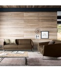 A delineare i morbidi volumi, un particolare bordino a rilievo corre lungo i profili del rivestimento.