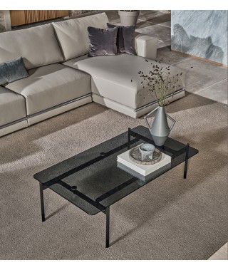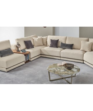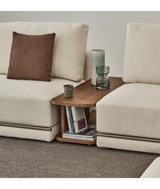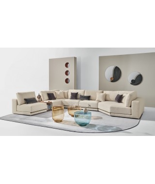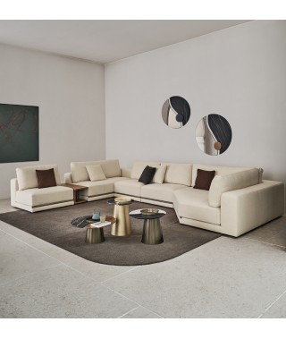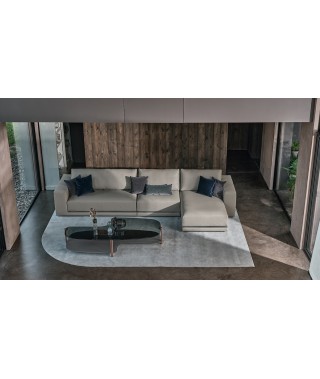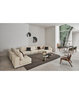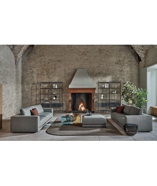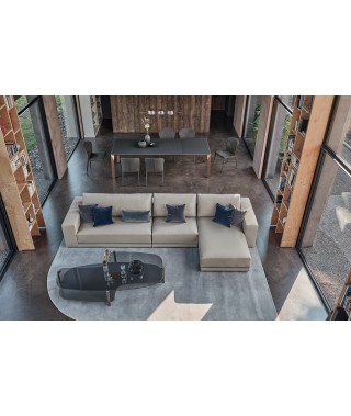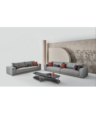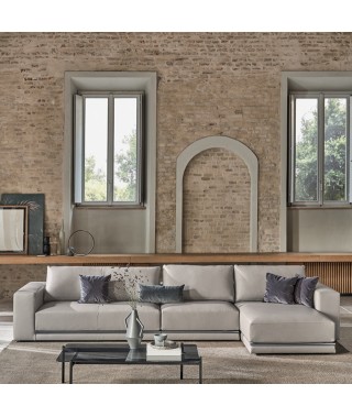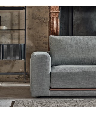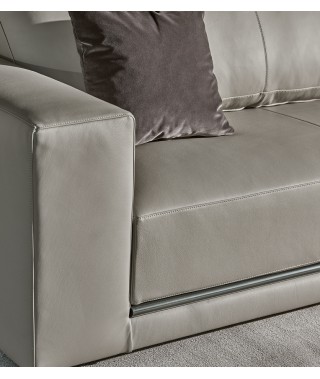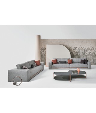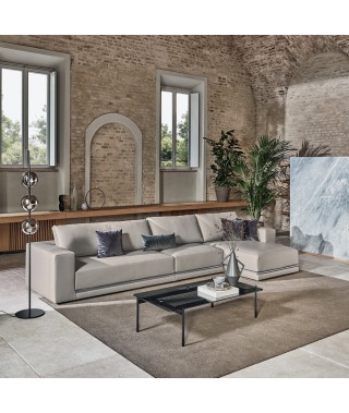 La rigorosità delle forme compatte contrasta con la morbidezza delle imbottiture e con l’ampia e confortevole seduta. La rifinitura in tondino di metallo che percorre la lunghezza alla base del divano è un prezioso dettaglio di carattere dallo stile contemporaneo.