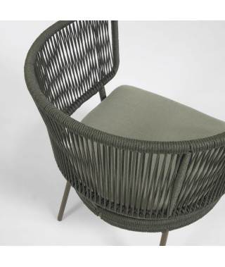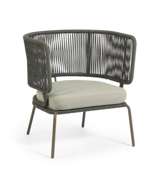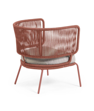 Connettiti con l'ambiente grazie alla poltrona Nadin, mix di acciaio e corda intrecciata uniti dal terracotta, un tono che ci avvicina alla natura.