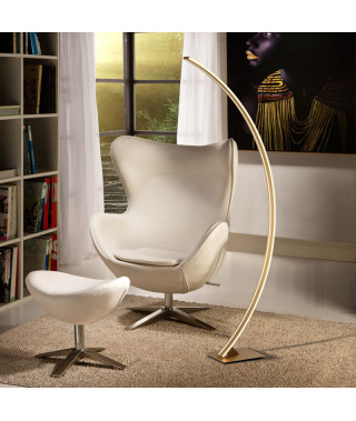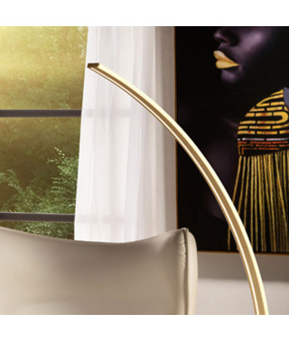 Piantana a luce LED in metallo e alluminio rifinito in oro spazzolato. Diffusore in silicone opalescente. 38W LED, 1.800 lumen, 3.000 K.