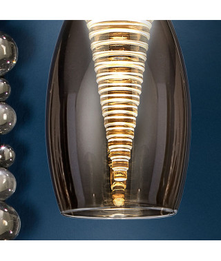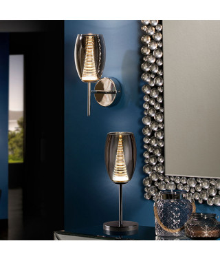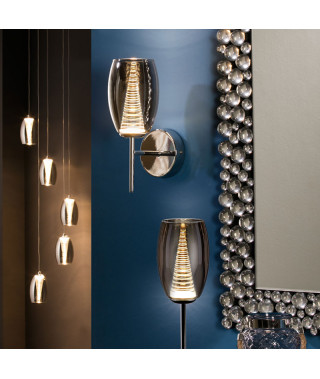 Applique a 1 luce LED, in metallo cromato. Paralume doppio, parte esterna in vetro a specchio e interna in policarbonato trasparente a forma di cono scalare. 5W LED. 450 lumen. 3.000 K