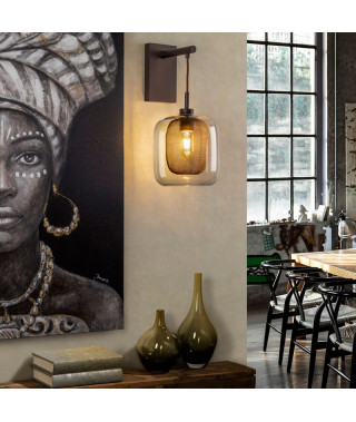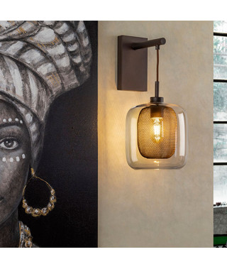 Lampada da parete a 1 luce, in metallo laccato color cioccolata. Doppio paralume, quello interno a rete metallica e quello esterno in vetro.