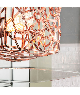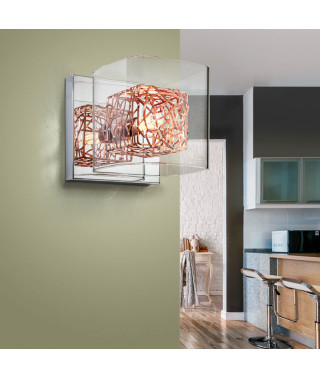 Applique a 1 luce, in metallo cromato. Paralume di vetro modellato e struttura interna cubica di filo di rame.
