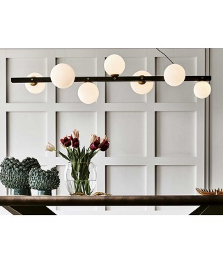 É realizzata in ferro brunito con dettagli in ottone spazzolato, grazie al paralumi in vetro soffiato bianco satinato, questo prodotto acquisisce una vena pura ed elegante, dalle forme gentili ed allo stesso tempo impressionanti. Planeta è perfetta per living classici e moderni, minimali o molto dettagliati, si adatta ad ogni occasione.