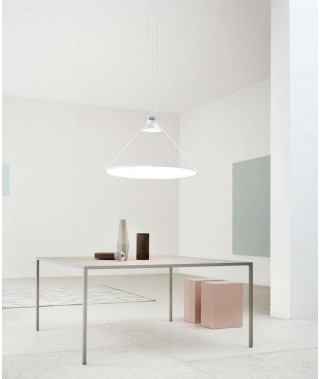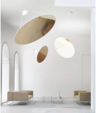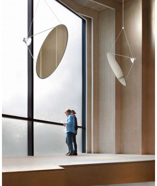 La sfida progettuale di Amisol è di realizzare una lampada a sospensione che occupa un ampio spazio fisico con un volume ridotto al minimo orientabile nello spazio. Un film bianco traslucido o una membrana a specchio metallizzata è tesa all’interno di un profilo circolare in alluminio. Come una vela solare, una fonte luminosa incredibilmente potente proietta un fascio di luce sul grande, leggerissimo disco, sia diffondendo che riflettendo la luce. Aste sottili collegano i due elementi principali. Modificando la lunghezza e i punti di collegamento dei due fili di sostegno, la rotazione del disco può essere impostata in qualsiasi angolazione.