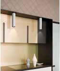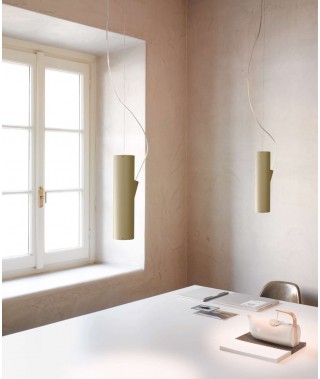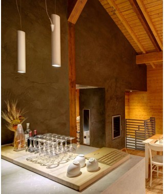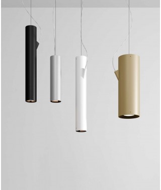 Apparecchi a sospensione in alluminio in due diametri e differenti lunghezze. L’ingresso del cavo di alimentazione nella parte laterale del cilindro permette di ottenere un’emissione bidirezionale priva di ombre a soffitto. La sorgente in posizione arretrata aumenta l’angolo di schermatura e il comfort luminoso.
