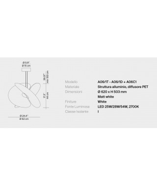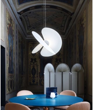 Le dimensioni sono importanti eppure l’immagine complessiva risulta eterea, come di un organismo fluttuante nello spazio. Levante (il cui nome rimanda alla leggerezza e al vento ma ha anche un chiaro riferimento all’estetica orientale) nasce dall’intersezione di tre grandi ventagli, realizzati in un materiale inedito nel settore design, proveniente dal settore del food, con un aspetto che ricorda la carta di riso, in grado di diffondere uniformemente la luce su tutta la superficie.