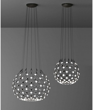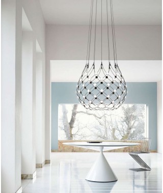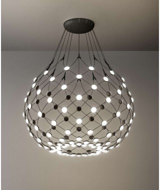 Una lampada dal forte impatto scenografico, la cui struttura leggera, quasi trasparente, composta da una rete di cavi flessibili all’incrocio dei quali sono posizionate le sorgenti LED, nasconde le complessità del progetto e, smaterializzandosi, lascia spazio soltanto alla luce, unica e vera protagonista. Disponibile in tre differenti dimensioni (diametro 55, 80 e 100 cm) la sospensione Mesh garantisce una distribuzione ottimale della luce negli ambienti.
