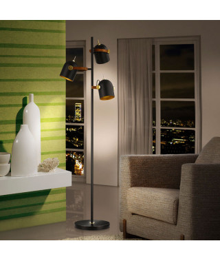 Piantana a 3 luci, in metallo rifinito in nero opaco e oro con decorazioni in ottone lucido. Sostegno a “U” foderato in similpelle marrone.