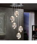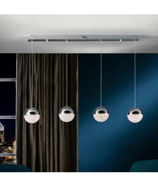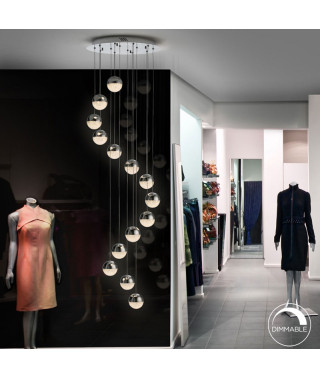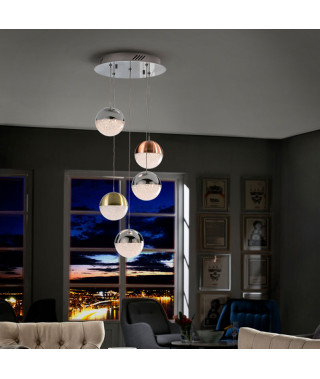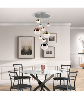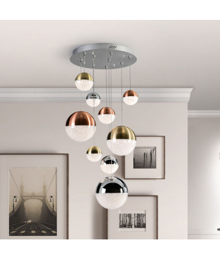 Lampada a sospensione a 9 luci LED, in metallo cromato. Paralumi sferici da Ø10 cm., Ø12 cm., Ø20 cm. in policarbonato testurizzato all’interno e metallo rifinito in rame, ottone satinato e cromo. Regolabile in altezza. 54W LED. 3.000K. 3.780 lumen.