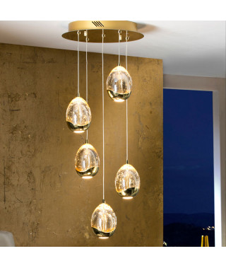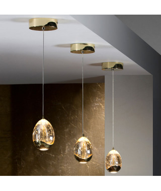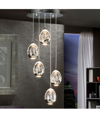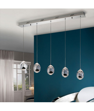 Lampada a sospensione a illuminazione LED, realizzata in metallo cromato. Paralumi a forma di goccia in vetro pieno e bolle d’aria ornamentali all’interno, regolabili in altezza. 25W LED. 2.400 lumen. 3000K.