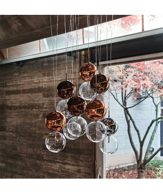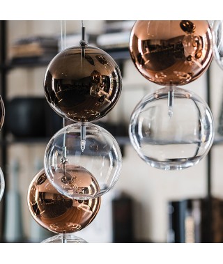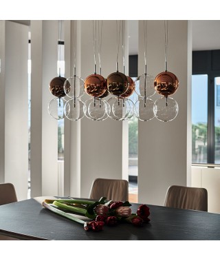 Sfera inferiore in vetro trasparente e sfera superiore verniciata cromo, rame, bronzo o trasparente. Attacco a soffitto in acciaio inox. S1: attacco singolo. S5: attacco rettangolare per 5 paralumi. S8R: attacco rotondo per 8 paralumi. S8oval: attacco ovale per 8 paralumi. Lampadina inclusa.,