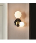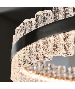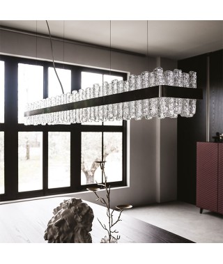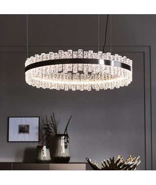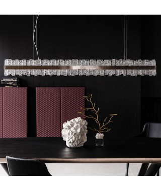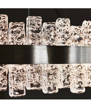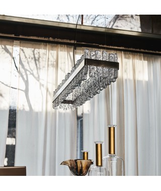 Lampada a soffitto con struttura in acciaio Nichel satinato ed elementi in vetro lavorati a mano.