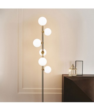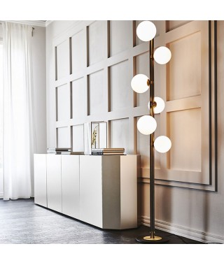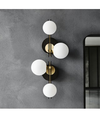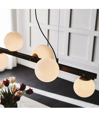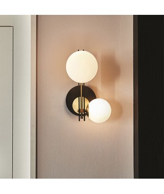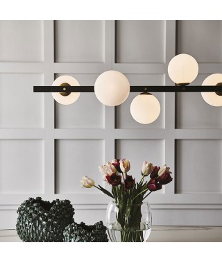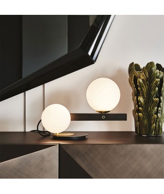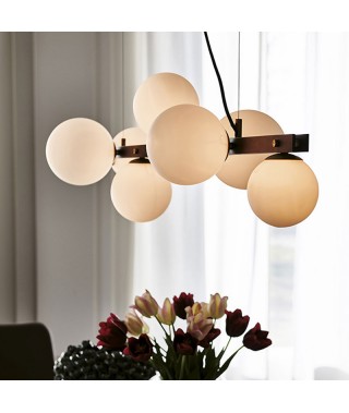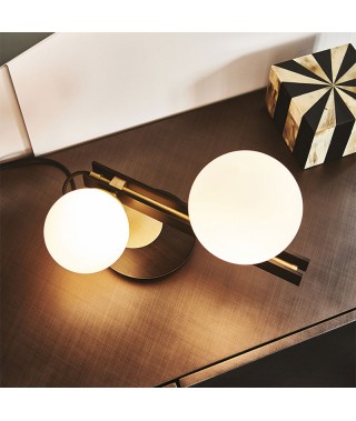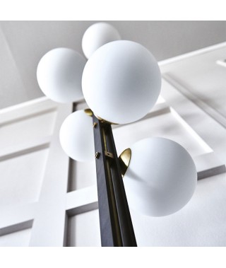 Lampada da tavolo, sospensione, applique e piantana con struttura in ferro brunito e dettagli in ottone spazzolato. Paralumi in vetro soffiato bianco satinato. Lampadine incluse.