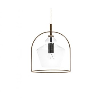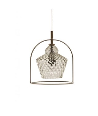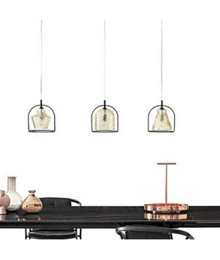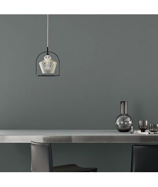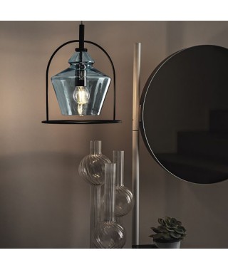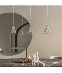 Lampada a sospensione con rosone cromato e cavo trasparente. struttura in Acciaio laccato. Paralume in vetro soffiato a mano.