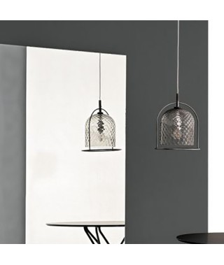 Lampada a sospensione con rosone cromato e cavo trasparente. struttura in Acciaio laccato. Paralume in vetro soffiato a mano.