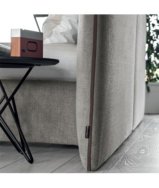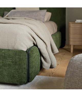 Il letto Zip è disponibile con rete fissa ed è realizzabile con rivestimento in stoffa o pelle a cui abbinare la zip beige, marrone, grigio chiara o grigio scura.
