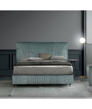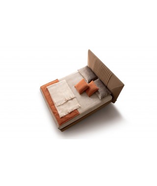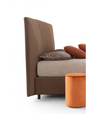 Sono le cuciture a caratterizzare questo splendido letto. Le trapuntature verticali della testata ritornano sul giroletto e le due curve, con gros grain in tinta o a contrasto, danno un tocco finale estremamente raffinato.