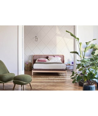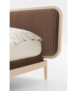 Ispirazione classica e attitudine contemporanea, unite da un brillante design che non passa inosservato. Il fascino della tradizione prende corpo attraverso un lessico estetico attuale e raffinato, dal gusto retrò. Leggeri i volumi, eloquenti e preziose le lavorazioni, come la plissettatura artigianale della testiera, elegante ed imponente anche in versione liscia. In legno grissinato laccato sono realizzati i vezzosi fianchi, che accolgono la morbida struttura imbottita perimetrale alla rete.