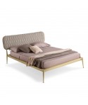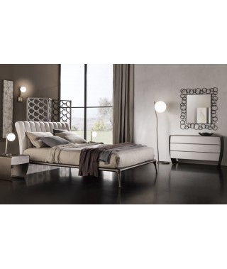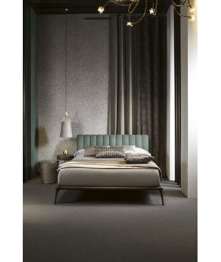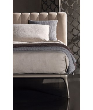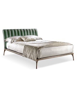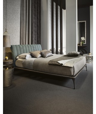 La struttura perimetrale e i piedi sono in fusione di alluminio, decorati in bronzo; la testata imbottita, con trapuntatura verticale, è rivestita con velluto, tessuto, pelle, ecopelle o con tessuto/pelle fornito dal cliente. Un’aura vintage che rende accogliente l’intera camera da letto.