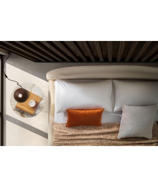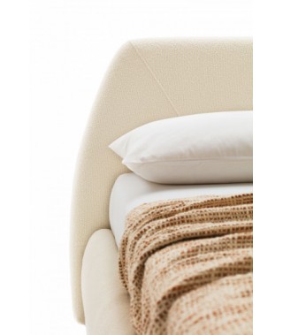 Robusto e saldo il piano su cui poggia la curvilinea linea dell’orizzonte suggerita dalle arcuate cuciture della testiera: un letto che si fa metafora del mondo. La compatta base di Belmondo racchiude, quasi come un nucleo vivo, uno spazioso contenitore rivestito all’esterno da un raffinato tessuto in similpelle.