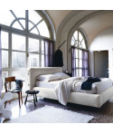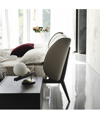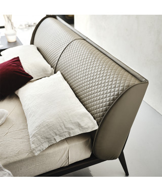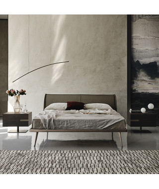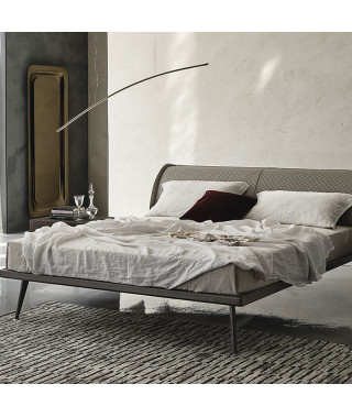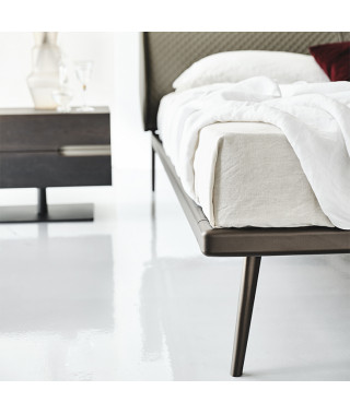 Letto con struttura in acciaio verniciato goffrato titanio (GFM11) o bronzo (GFM18). Testiera interamente rivestita in tessuto, synthetic nubuck, micro nubuck, ecopelle o pelle nei colori come da campionario.