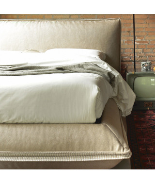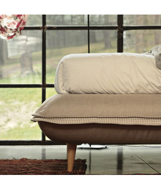 Il letto è realizzabile in tinta unita, scegliendo il rivestimento nella vasta gamma del campionario oppure negli speciali abbinamenti Inspiration, con interno del doppio voulant in pied de poule, tessuto Maratea e rivestimento in tessuto Cervia.