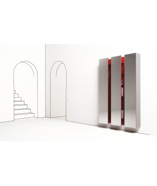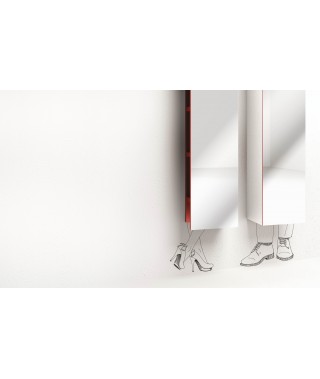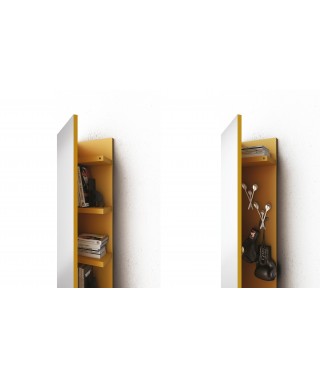 Specchio e contenitore. Un prodotto dalla geometria semplice e dalle proporzioni raffinate. La porta rivestita interamente a specchio crea un gioco di riflessi sul fronte e sul lato. Il lato aperto svela la sua funzione e al tempo stesso dona leggerezza al volume compatto.