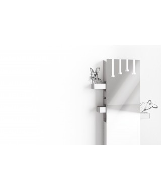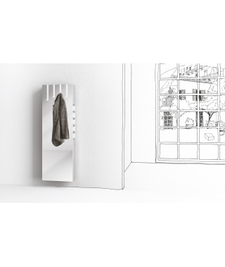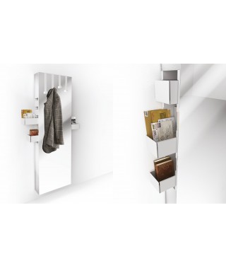 Specchio a parete, struttura in agglomerato di legno con 4 appendini (removibili) e 5 cassetti in metallo. I cassetti si estraggono totalmente da entrambe i lati.