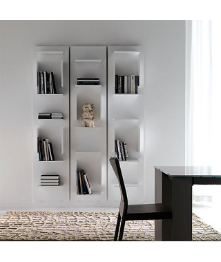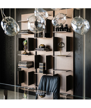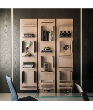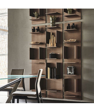 Libreria componibile a muro in legno goffrato bronzo (GF15) o bianco (GF71). Fornita di attacchi per aggancio sopra/sotto.