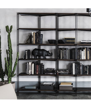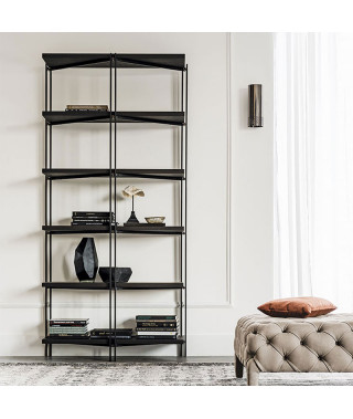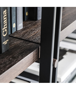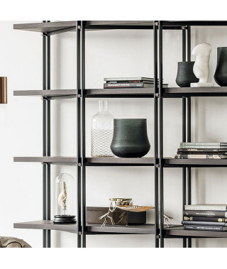 Libreria modulare con struttura in acciaio verniciato goffrato titanio (GFM11), graphite (GFM69), bianco (GFM71) o nero (GFM73). Ripiani in legno verniciato goffrato graphite (GF69), bianco (GF71), in noce Canaletto (NC) o rovere bruciato (RB). Particolari in acciaio verniciati bronzo satinato. Per il posizionamento centrostanza si consiglia l'utilizzo di almeno due moduli.