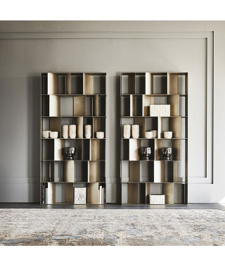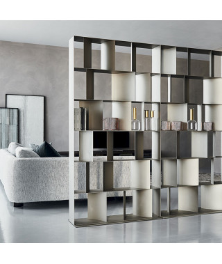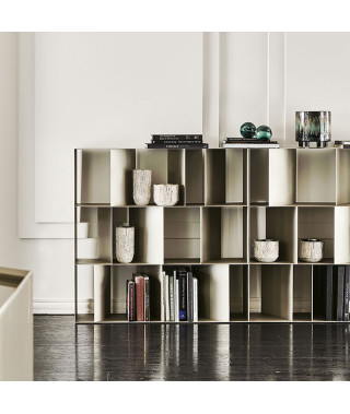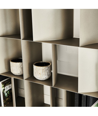 Libreria in acciaio goffrato titanio (GFM11), bronzo (GFM18), graphite (GFM69) o nero (GFM73), componibile mediante affiancamento o sovrapposizione del singolo modulo. Fissaggio a parete necessario se non provvisto di zavorra optional.
