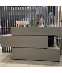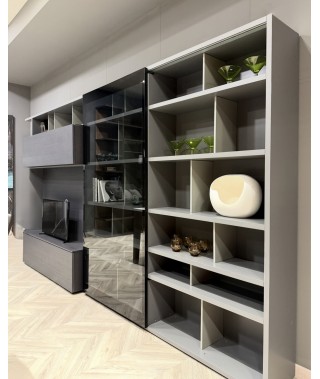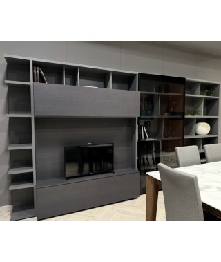 Parete attrezzata con spazio teca in struttura piombo opaco, ante rovere grigio e vetro fumè.