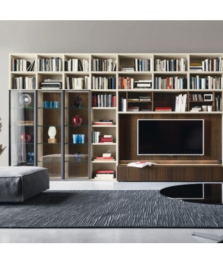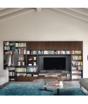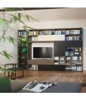 schienale per TV con luce di cortesia, contenitore MODO sporgente a terra e RASTER superiori da 15 mm di spessore e schienale corrispondente impiallacciati rovere termotrattato