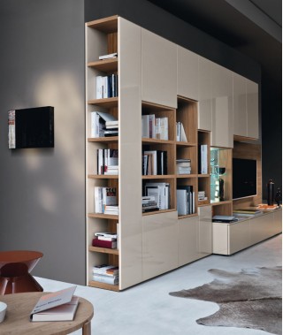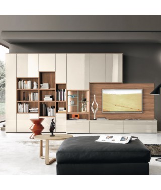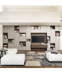 struttura con fianchi e ripiani da 30 mm di spessore, pannello TV con lavorazione a folding e schienali impiallacciati noce