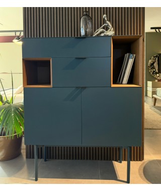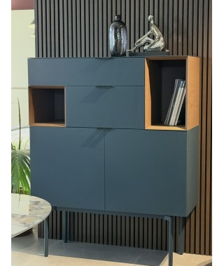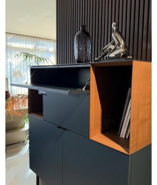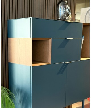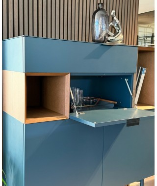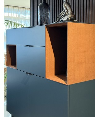 Madia Brema, struttura e frontale laccato Opaco Mirto, dettagli a Giorno Castagno, maniglia S Cuoio Nero.