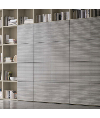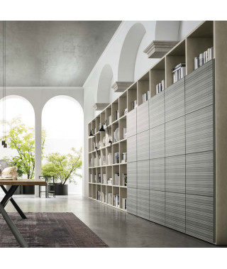 La libreria alterna moduli con e senza schiene, volumi aperti o chiusi da ante decorative: una grande varietà stilistica.