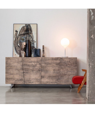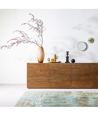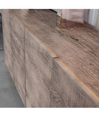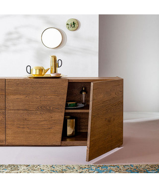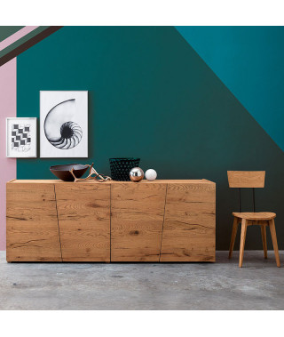 Al 100% in Rovere massello, esibisce con fierezza la sua natura: le venature del legno scorrono senza interruzioni su tutto il frontale, attraversando le linee diagonali delle ante.