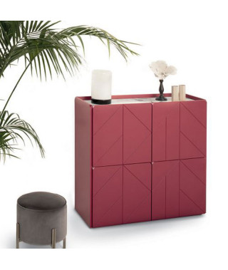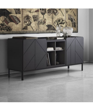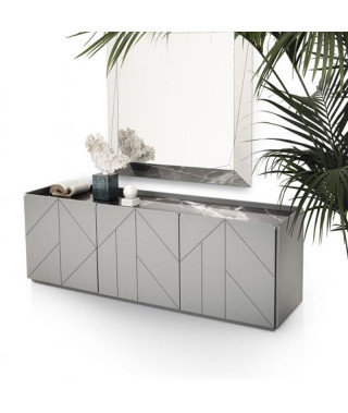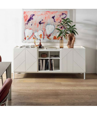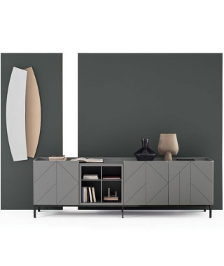 Gruppo madie con struttura in legno, composte da ante a battente e vani a giorno, fianchi e ante in legno laccato decorato. Top a scelta. Con zoccolo o telaio con piedini in Acciaio laccato.