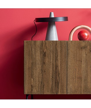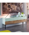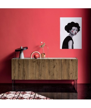 Maniglie in ferro e montatura scorrevole attualizzano le ante a telaio della madia Eclettica. Mentre le lavorazioni più contemporanee del Rovere la rendono estremamente poliedrica