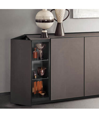 Ugualmente ricercata, ma più eccentrica, è l’apertura a scrigno delle ante laterali esterne, che ritroviamo anche nella nuova collezione di armadi Pianca.