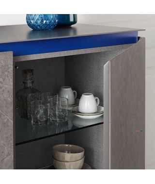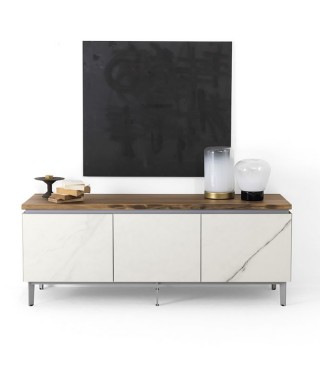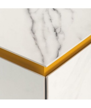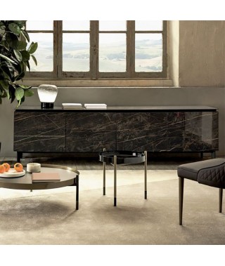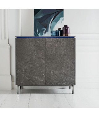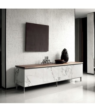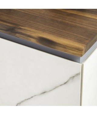 Gruppo madie con struttura in Legno, composte da ante, cassetti, vani a giorno, top, fianchi, frontali in SuperCeramica e SuperMarmo.Sistema di apertura con gola.