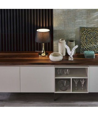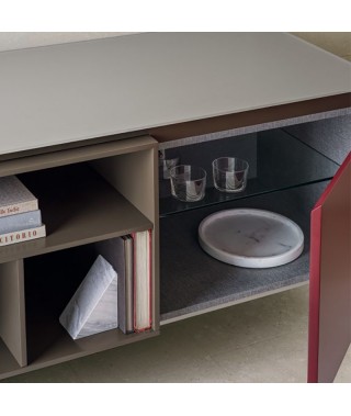 Gruppo madie con struttura in Legno, composte da ante, cassetti, vani a giorno, top, fianchi, frontali in Legno laccato.