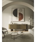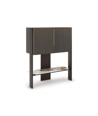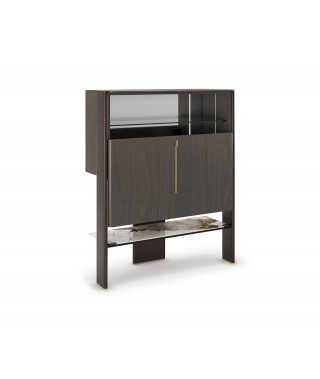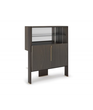 L'intera struttura è rifinita nell'esclusiva finitura Oxybrass, spazzolata a mano libera con maestria artigianale. Mentre in corrispondenza delle ante sono appunto applicati degli inserti in pregiato legno rovere bruciato, i quali danno dinamicità alla struttura sporgendo verso l'esterno.