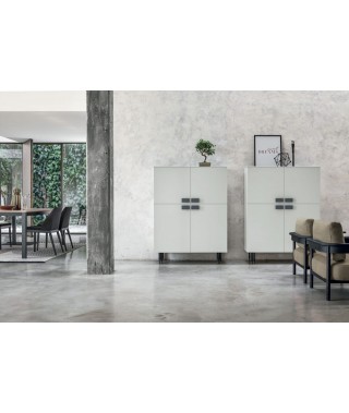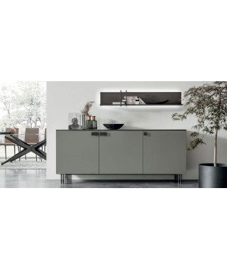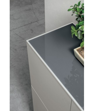 L’originale basamento con doppio piedino sostiene il design lineare della madia, in entrambe le sue versioni. Top in gres o vetro, maniglia decorativa in metallo e frontali in più finiture e colori: matericità diverse per un arredo unico.