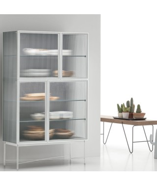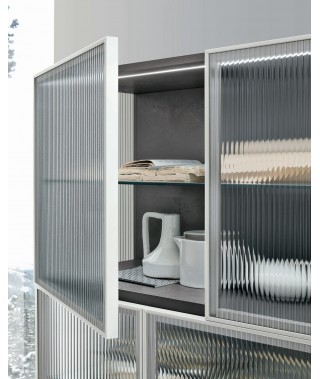 Design minimal e vetro canneté per una madia di ispirazione retrò che dialoga apertamente con uno stile di arredamento moderno. L’effetto vedo non vedo dà eleganza al mobile e all’ambiente nel quale viene inserito.