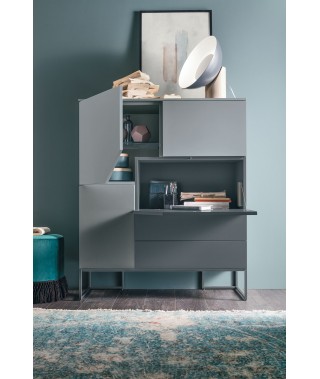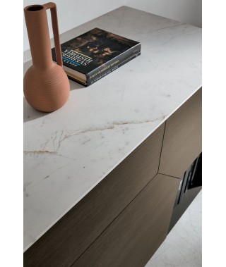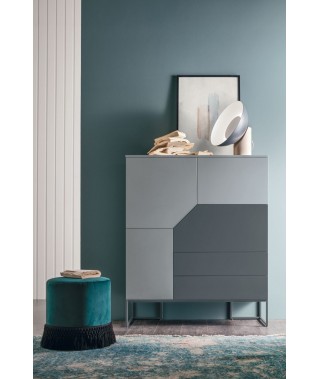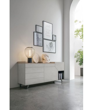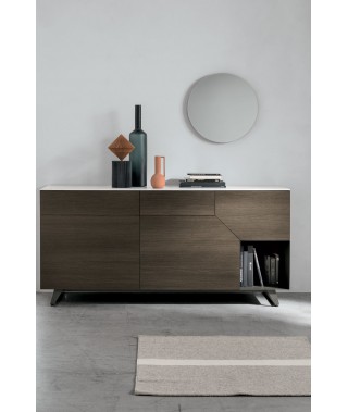 L’angolo tagliato è il segno distintivo della madia: l’anta asimmetrica e l’accostamento di materiali diversi conferiscono originalità e personalità sia all’arredo, sia all’ambiente.