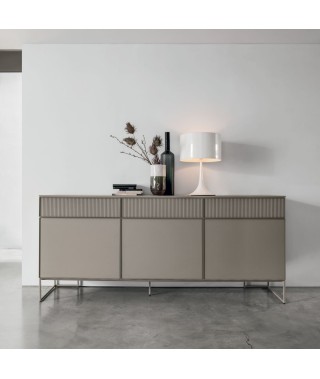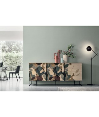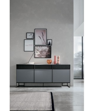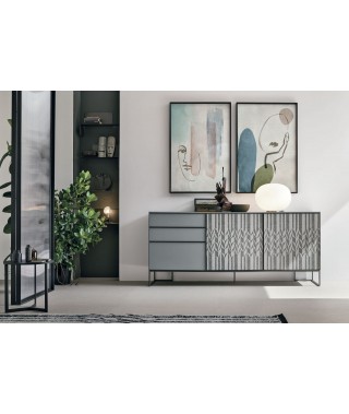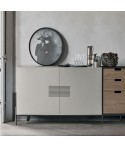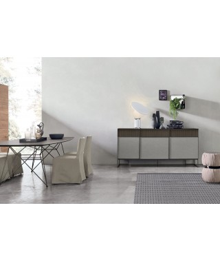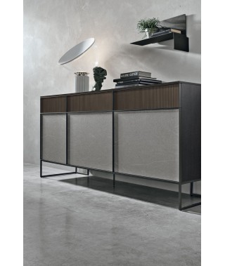 Il profilo in metallo incornicia i frontali in noce canettè ed effetto pietra: il mix di finiture dà all’arredo una forte impronta grafica e materica. La madia può assumere diverse configurazioni adattandosi a tutti gli stili moderni.